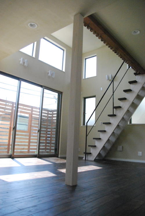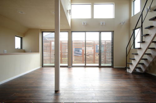 テラスに面した大きな掃出し窓をもつLDKは 吹抜け、高窓などで 更に明るく開放的な空間に |