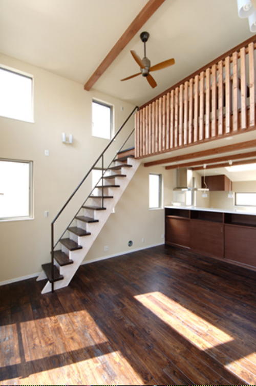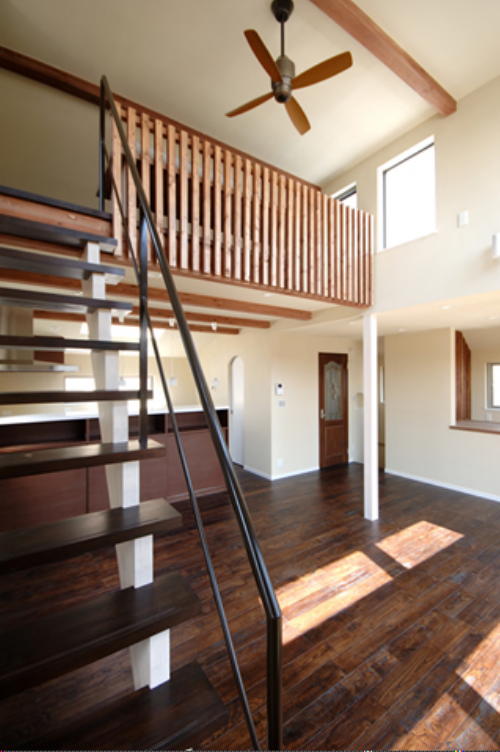 吹抜けの上部には 吹抜けに面して ロフトスペースを設置しています。 木製のスケルトン階段が リビングのアクセントになっています。 |