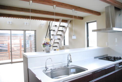 キッチンからは リビング・ダイニングだけでなく テラスやロフトへの階段も一望できるから 家族の様子がとってもよくわかる |